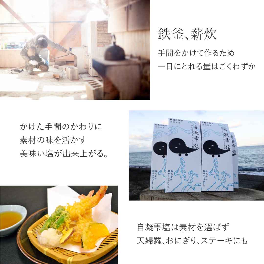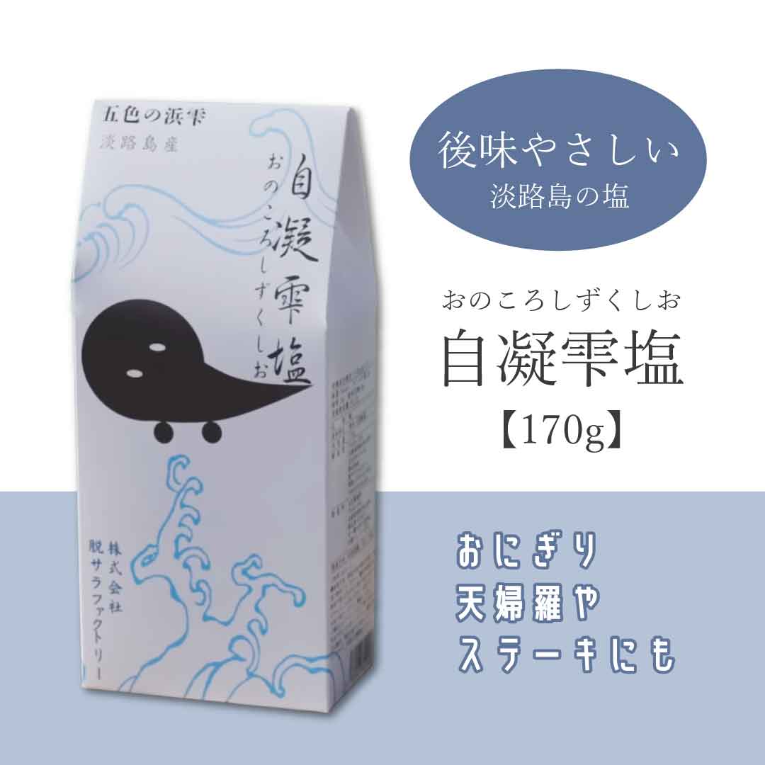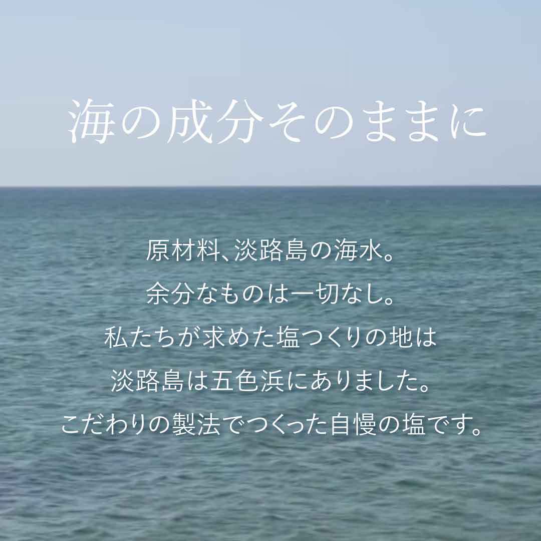 淡路島の五色浜で汲み上げた海水から生まれる、五色の浜雫・自凝雫塩(おのころしずくしお)。