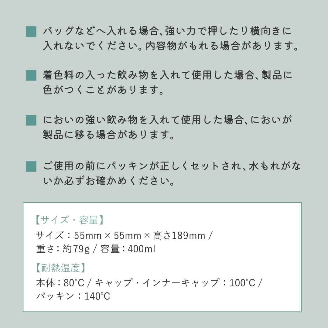 容量は手ごろな400mlで通勤バッグにも収まるので、レジャーだけでなくオフィス用としてもおすすめです。